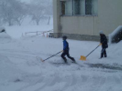 朝早くから昇降口前の雪かきに取り組んでいた6年生。